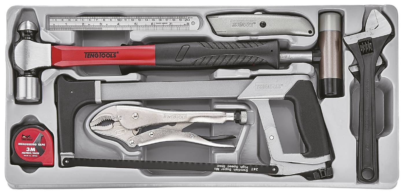 9-osainen työkalusarja: 2 jakoavainta, yleispihti, yleisveitsi, rautasahanrunko, muovivasara, mittanauha, teräsviivain ja pallopäävasara.