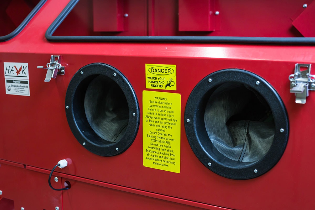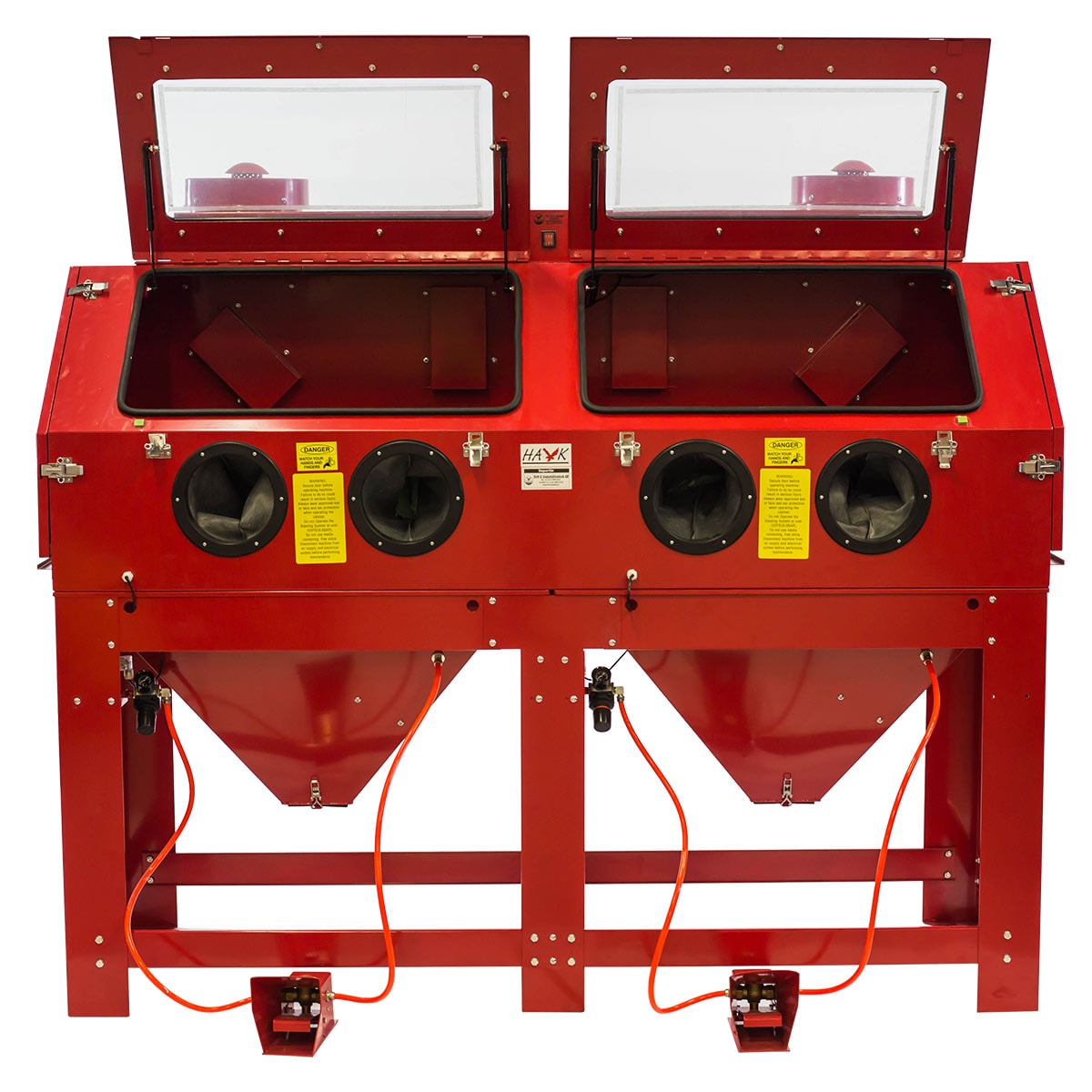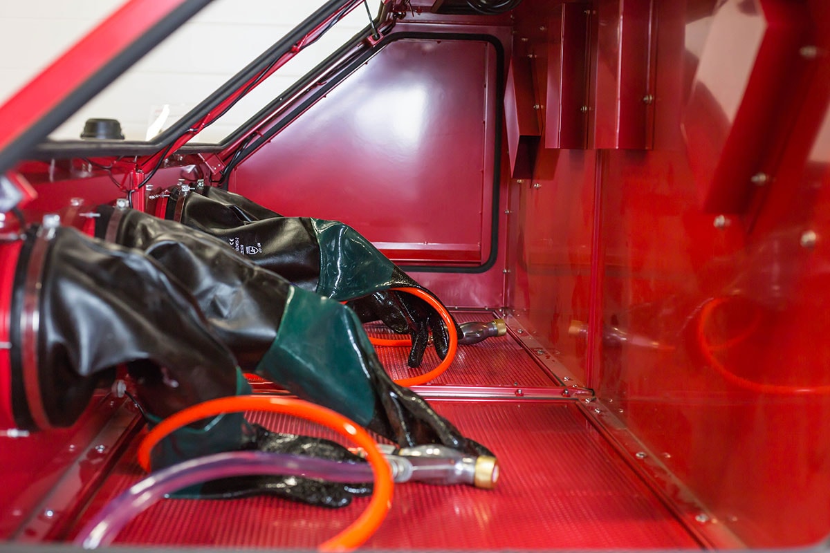 Tehokas puhalluskaappi teollisuusmallia täydet 880 litraa. Tämä erittäin suuri puhalluskaappi on varustettu kahdella rinnakkaisella työpisteellä, kahdella avattavalla etuovella ja kahdella avattavalla sivuovella, mikä tekee työstettävien kappaleiden asettamisen ja poistamisen helpoksi ja käteväksi. Kaappi on varustettu puhalluskäsineillä, kahdella puhalluspistoolilla ja kahdella poistotuulettimella, mikä mahdollistaa optimaalisen näkyvyyden kaapissa työn aikana. Koska puhalluskaappi on varustettu kahdella eri asemalla, on mahdollista käyttää kahta erilaista puhallusainetta samassa kaapissa ilman, että puhallusaineita tarvitsee tyhjentää ja vaihtaa. Kaappi on myös varustettu tukevilla jalkapolkimilla, jotka ohjaavat venttiilejä, jotka vapauttavat puhallusaineen puhalluspistooleihin.