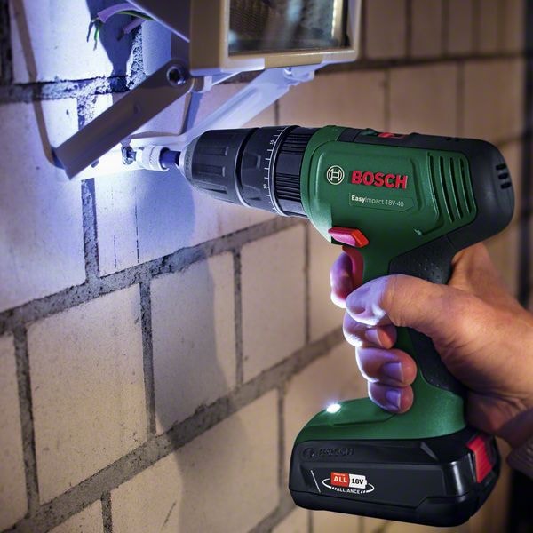 Akkukäyttöinen EasyImpact 18V-40 -iskuporakone on monipuolinen työkalu mitä erilaisimpiin poraus- ja kiinnitystöihin. Siinä on 2-portainen vaihteisto nopeaan poraamiseen ja tehokkaaseen ruuvaamiseen. Sen 20 vääntömomenttiporrasta mahdollistavat maksimaalisen ruuvaustarkkuuden. 13 mm:n pikaistukka takaa poraterien ja ruuvauskärkien helpon vaihdon. Ergonomisen rungon ja sisäänrakennettujen LED-valojen ansiosta voit työskennellä tehokkaasti ja mukavasti myös huonosti valaistuilla alueilla. Tämä laite on oikea valinta, kun työkohteena on puu, metalli, muovi tai kiviseinä. Työkalu kuuluu POWER FOR ALL ALLIANCE -järjestelmään. Yhdellä akulla voi käyttää monia erimerkkisiä työkaluja.