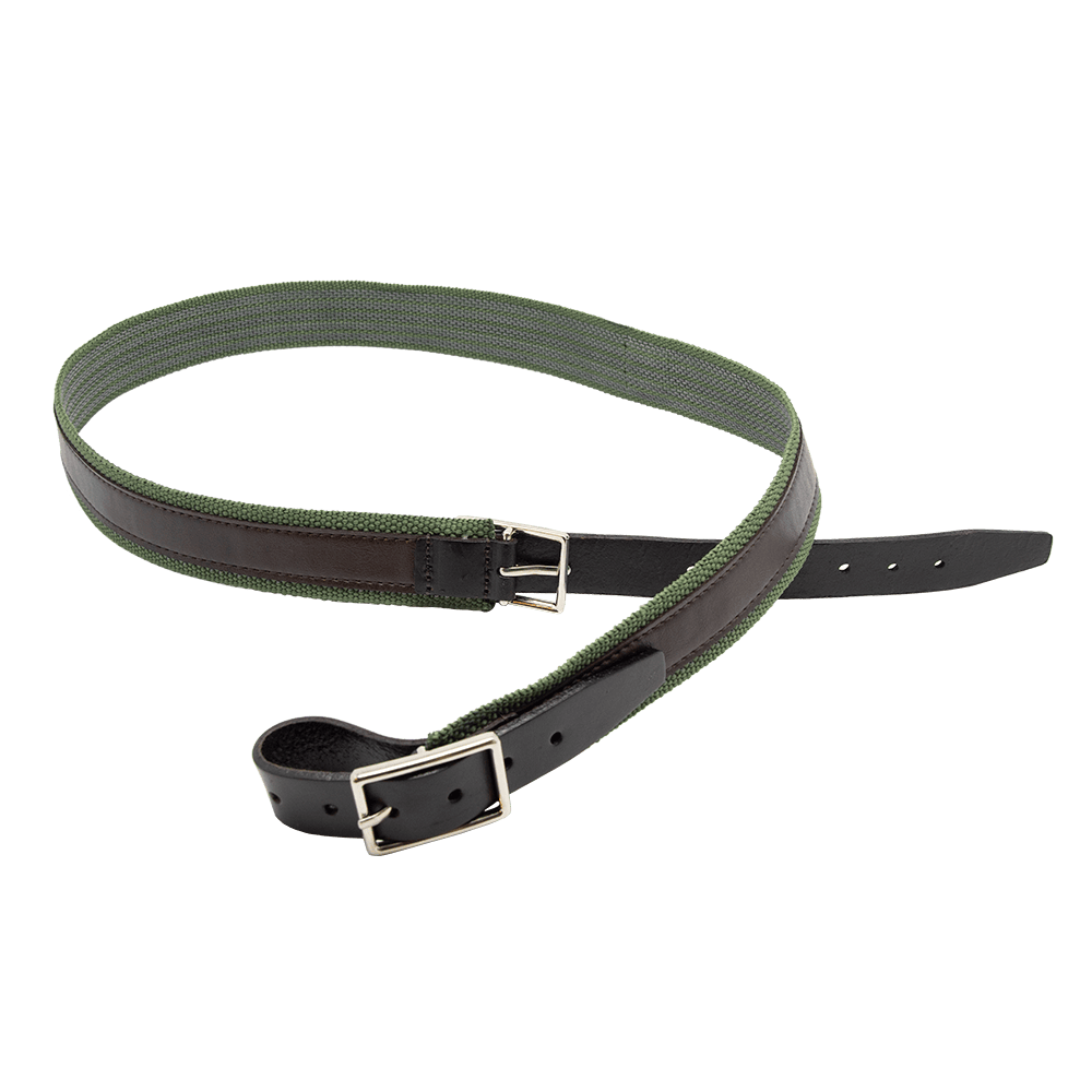Tyylikäs asehihna 5etalta. Valmistettu vahvasta vihreästä polyesterinauhasta, jossa on ommeltu ruskea keinonahka. Hihnan takapuoli on kumipäällysteinen, mikä estää hihnan liukumisen pois olalta.