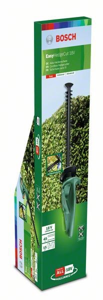 EasyHedgeCut 18-45 on täydellinen pienten ja keskisuurten pensaiden hoitoon ja leikkaukseen. Sen poikkeuksellisen kevyt rakenne, vain 2,3 kg, ja ergonominen muotoilu mahdollistavat miellyttävän käsittelyn eri työskentelyasennoissa ja vähentävät ylävartaloon kohdistuvaa rasitusta pidempään kestävissä töissä. Optimaalisen voiman tuottava 18 V:n Li-ion-akku yhdistettynä Boschin lukkiutumisenestojärjestelmään takaa erinomaiset edellytykset voimakkaalle ja jatkuvalle leikkuulle, ilman esimerkiksi jumiutumisesta johtuvia keskeytyksiä, sekä siisteille tuloksille. Akkuversio mahdollistaa rajattoman käyttövapauden koko puutarhassa, ilman rajoituksia tai virtajohdon leikkaamisen riskiä. Työkalu kuuluu POWER FOR ALL ALLIANCE -järjestelmään. Yhdellä akulla voi käyttää monia erimerkkisiä työkaluja.