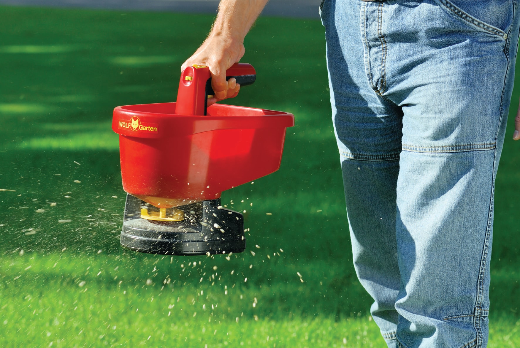 Jos sinulla on ajoleikkuri, saatavilla on myös perässävedettäviä levittimiä. WOLF-Garten Power Spreader on kädessä pidettävä yksikkö, ja sen levitysleveys on säädettävissä 0,5-2,5m välillä. Helppokäyttöinen ja soveltuu myös isompiin puutarhoihin.