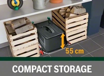 - Kaksinkertainen taitettava palkki ja pinottava nurmikkokerääjä säästävät tilaa.