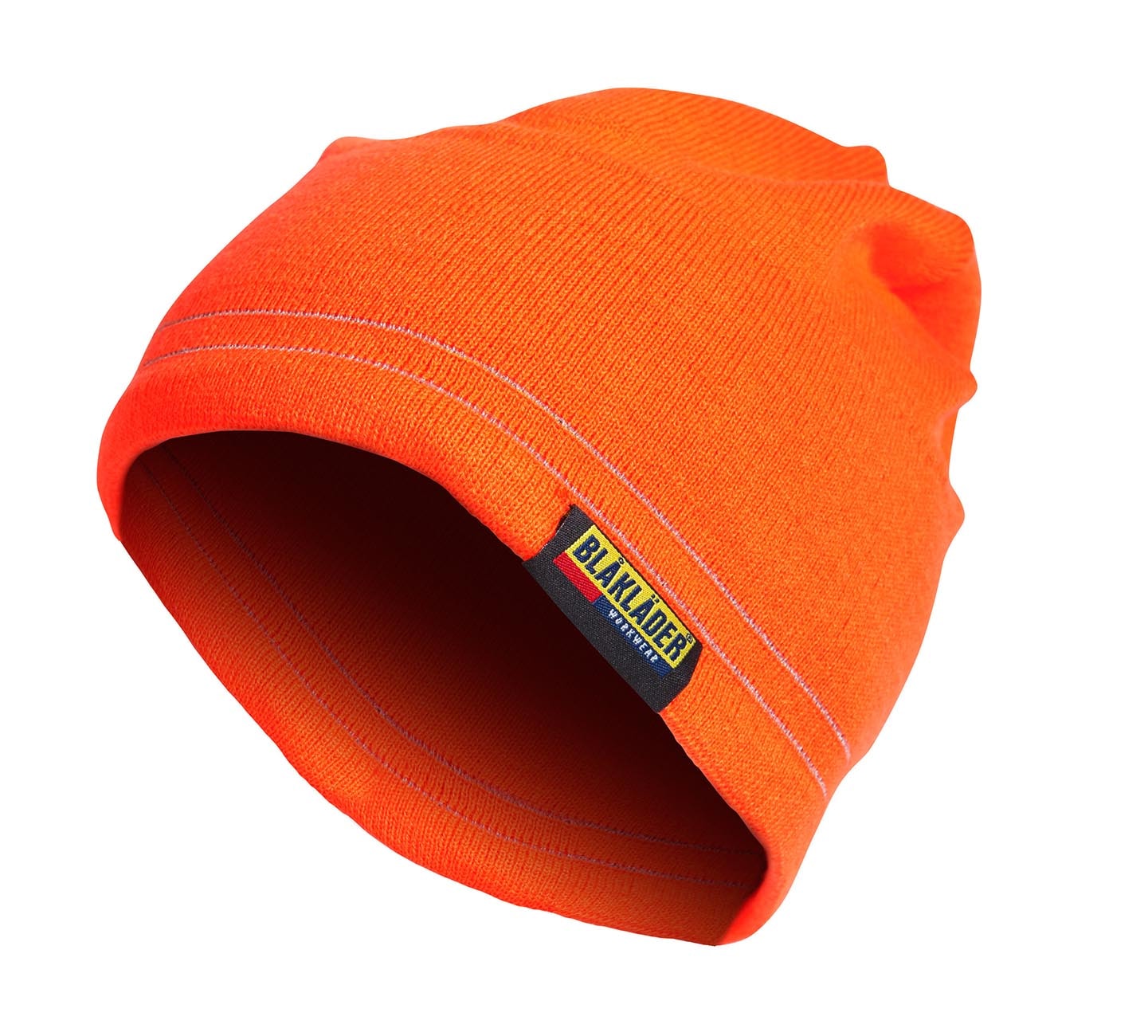 Huomiovärinen akryylipipo. Pipon ympärille neulotut heijastinnauhat lisäävät näkyvyyttä ja turvallisuutta.